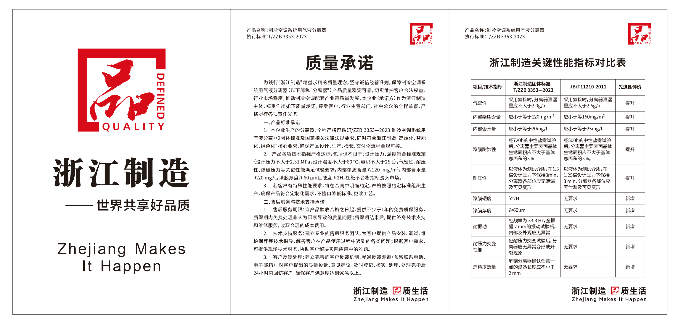 为践行"浙江制造"精益求精的质量理念,坚守诚信经营准章制冷空调系则,,保统用气液分离器(以下简称"分离器")产品质量稳定可靠,切实维护客户合法权益、行业市场秩序,推动制冷空调配套产业高质量发展,本企业(承诺方)作为浙江制造主体,郑重作出如下质量承诺,接受客户、行业主管部门、社会公众的全程监督,严格履行各项责任义务。一、产品标准承诺.本企业生产的分离器,全程严格遵循<<T/ZZB33532023制冷空调系统用气液分离器>>团体标准及国家相关法律法规要求,同时符合浙江制造"高端化、智能化、绿色化"核心要求,确保产品设计、生产、检验、交付全流程合规可控。2.产品各项技术指标严格达标,包括但不限于:设计压力、温度符合标准规定(设计压力不大于2.51MPa,设计温度不大于60C,容积不大于25L),气密性、耐压性、爆破压力等关键性能满足试验要求,内部杂质含量120mg/m2,内部含水量20mg/L,漆膜厚度60m且硬度2H,杜绝不合格指标流入市场。 3.若客户有特殊性能要求,将在合同中明确约定,严格按照约定标准组织生产,确保产品符合定制化需求,不擅自降低标准、更改工艺。